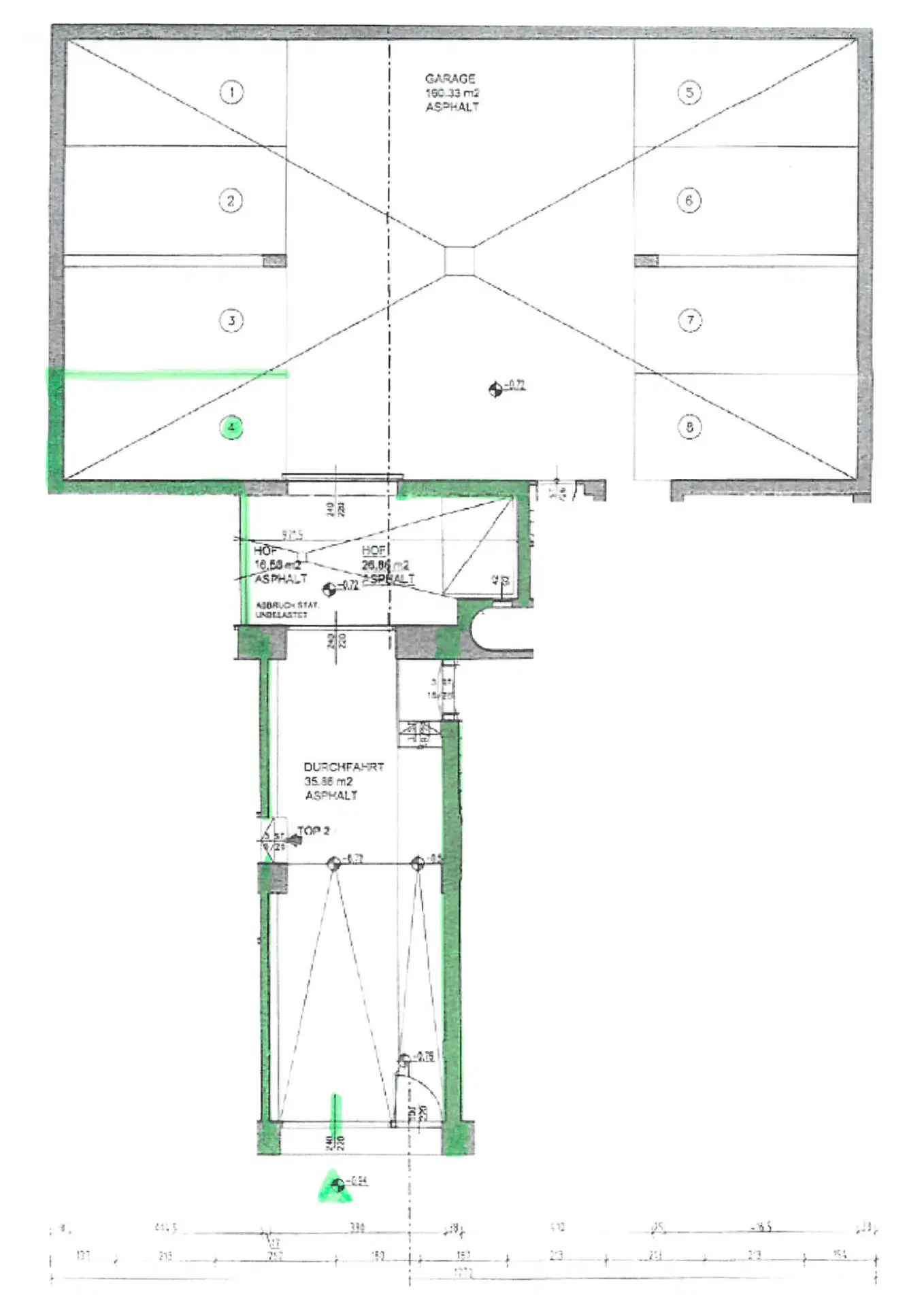 Achtung! Die Zufahrtsbreite des straßenseitigen Einfahrtstores beträgt nur 2,00 m. Diese Breite ist etwas geringer als das Tor im Hofgebäude Dieses zweite Tor (grün) hat eine Breite von 2,20 m und eine Höhe von 2,10 m. Die Maße des Parkplatzes: B = 2,30 m x L = 4,80 m.