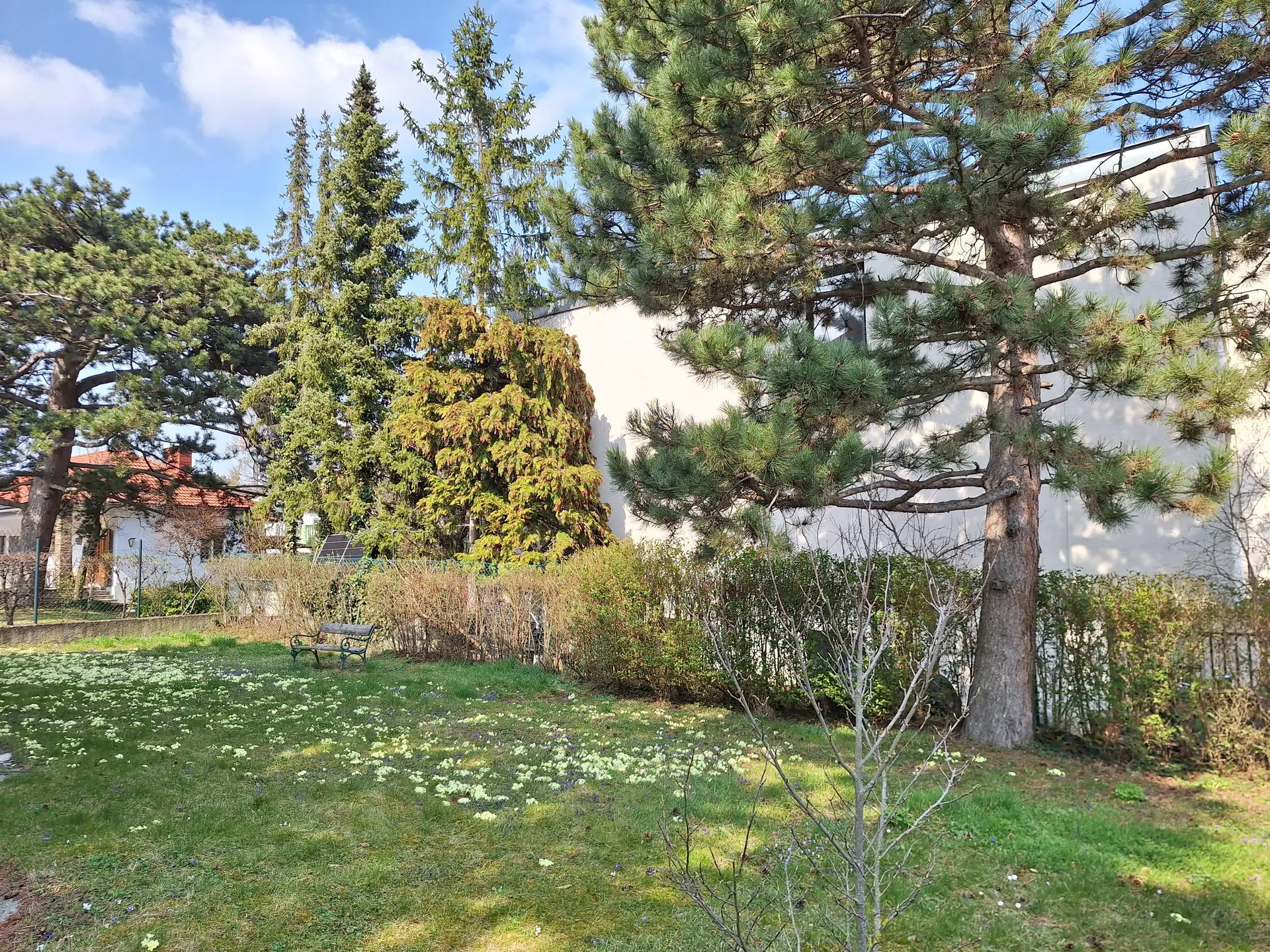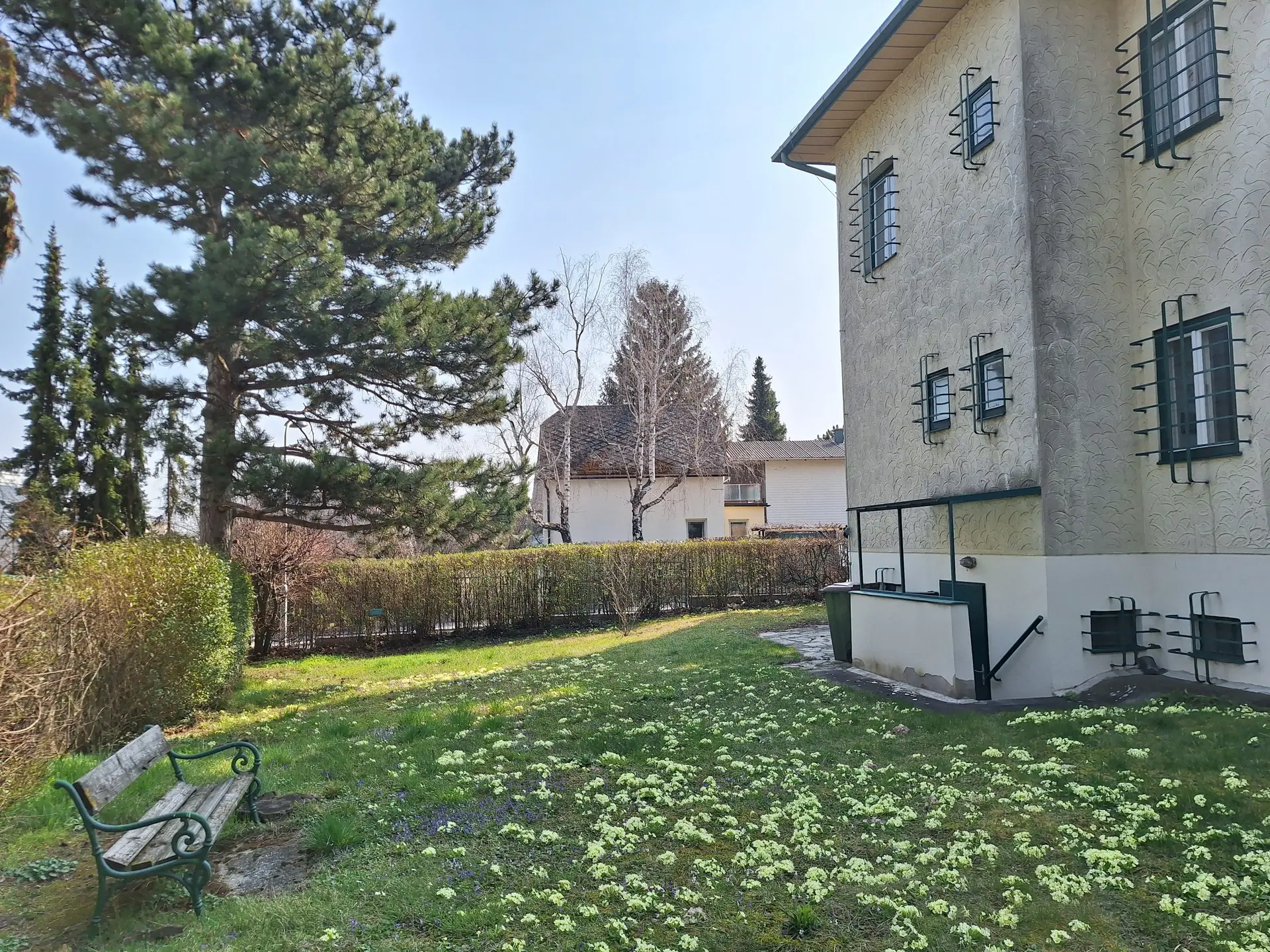 mit besonderem Reiz und einem gepflegten Garten voller blühender Primeln.